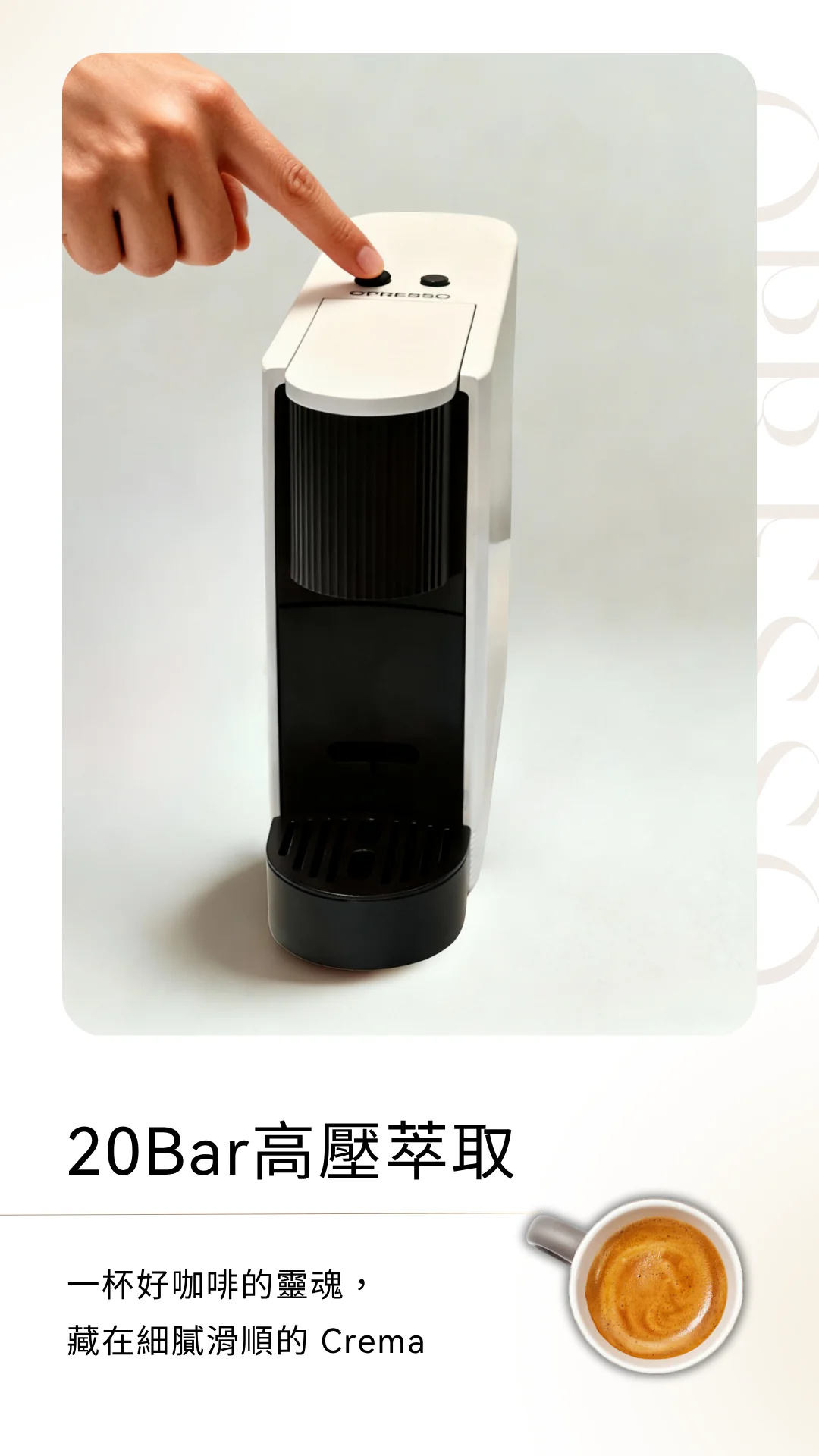 一杯好咖啡的靈魂,藏在那層細膩滑順的 Crema 裡。Opresso Slim 的心臟,是一顆強勁的 20Bar 高壓泵浦。