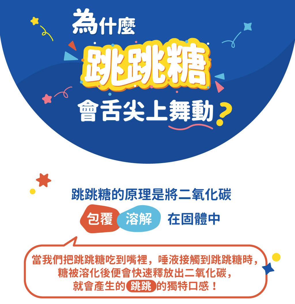 採用「益生元」包覆二氧化碳,取代一般糖份,開心放心吃的跳跳糖!
