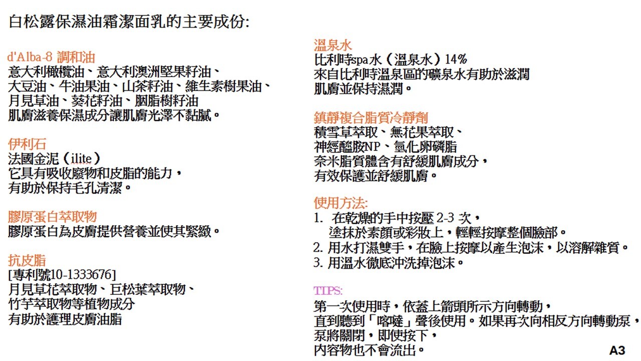白松露保濕油霜潔面乳的主要成份: